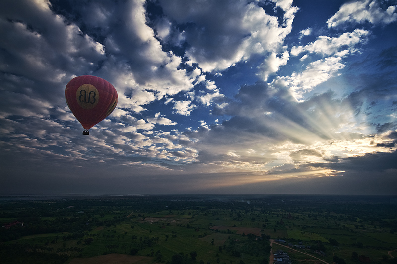 Der nächste Morgen beginnt bereits wieder um 4:30 Uhr mit dem Ausblick auf ein weiteres unvergeßliches Erlebnis. Nach einer scheinbaren Irrfahrt durch die stockfinstere Landschaft, auf der Suche nach dem richten Startplatz beginnen die Vorbereitungen zu einem Ballonflug über die Pagodenlandschaft. Unser Startplatz befindet sich in unmittelbarer Nähe des sehr umstrittenen Nanmyint Turms, ein Beton-Monument der Neuzeit das irgendwie gar nicht so recht in die Landschaft passen will. Ein letzter Brennertest und los geht´s, rechtzeitig kurz vor Sonnenaufgang. Lautlos, nur unterbrochen vom Brennergeräusch, gleiten wir über die Pagodenlandschaft, wahrlich ein unbeschreibliches Erlebnis. Die ungewöhnlichen Windverhältnisse führen unseren Ballon in ein Gebiet wo der Ballonveranstalter noch nie gelandet ist und von allen Seiten strömen staunende Menschen an den Landeplatz heran.
