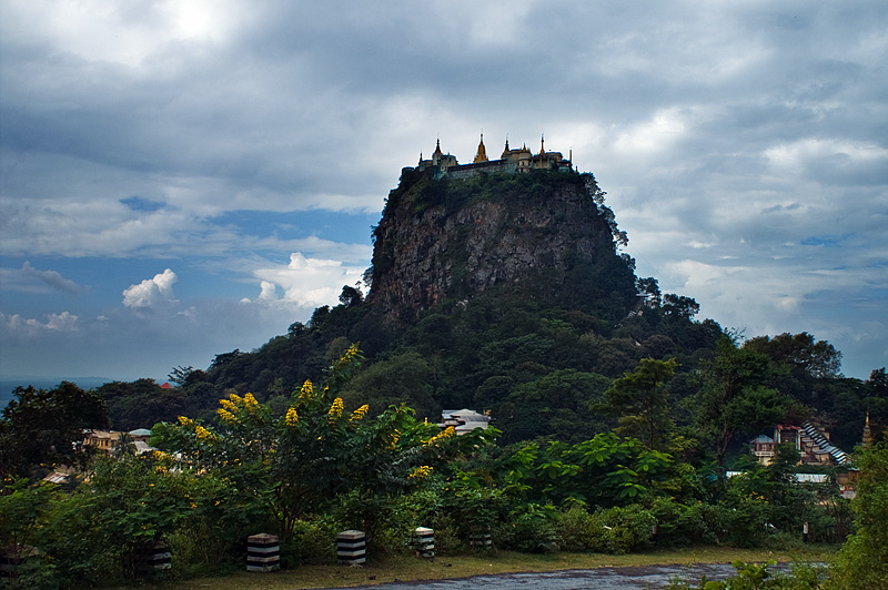 Der erloschenen Vulkankegel des Mount Popa gilt als Wohnstätte der Nats, der Schutzheiligen Myanmars, nur wer sie achtet kann rundum Frieden im Leben finden und mit Glück rechnen. Der Name der Felsnadel kommt aus dem Sanskrit und bedeutet soviel wie Blumenberg was auf die üppige Vegetation durch die fruchtbare Vulkanerde zurückzuführen ist. Am Fuße des Mount Popa hat sich ein kleines Affenvolk angesiedelt. Hier ist auf jeden Fall Vorsicht geboten, denn diese putzigen Tierchen haben es faustdick hinter ihren Ohren wenn es darum geht die Touristen um ein paar Habseeligkeiten zu erleichtern immer in der Hoffnung etwas eßbares es zu erhaschen.