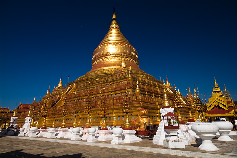 Am Stadtrand von Nyaung U befindet sich die Shwezigon Pagode. Einst eines von 5 Heiligtümern mit denen den erste Großkönig von Bagan, Anaw-rahta, das Gebiet seiner Hauptstadt absteckte. Heute ist die goldglänzende Pagode nicht nur eines der bedeutendsten Heiligtümer des Landes, sondern gilt auch als Prototyp der burmesischen Pagode schlechthin. Die glockenförmige Stupa hat nicht die schlanke, in die Höhe gezogene Form der Shwedagon Pagode, sondern wirkt wesentlich massiver und dickbäuchiger.