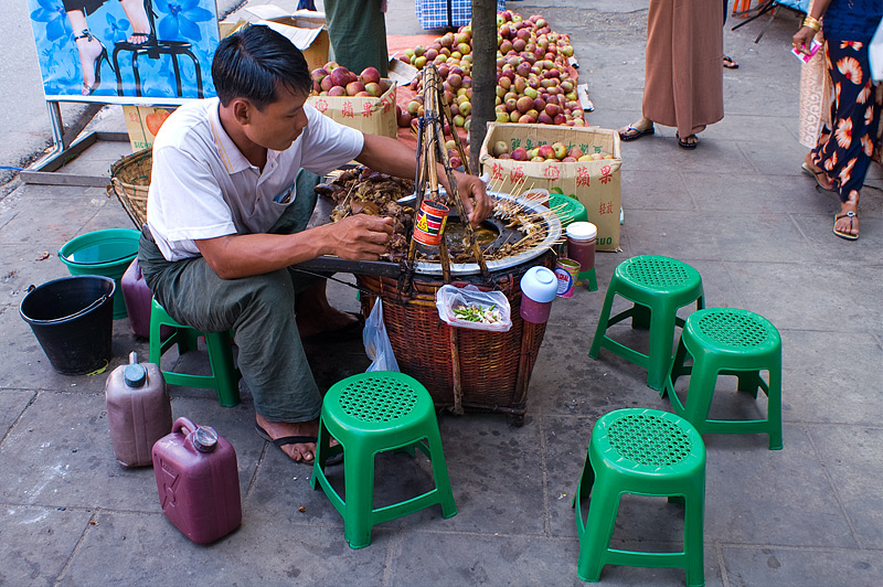 Weiter geht es durch die belebten Straßen Yangons in Richtung Scott Market. Interessant ist die Tatsache, daß sich trotzt Rechtsverkehr die Lenkung der Fahrzeuge auf der rechten und damit eigentlich auf der falschen Seite befindet, weil die Autos aus den Nachbarländern günstig, gebraucht importiert werden. Auffällig ist auch, daß sich keine Mopeds und Motorräder durch den Verkehr schlängeln wie es in anderen asiatischen Metropolen üblich ist. Diese wurden von der Regierung kurzer Hand verboten, Hupen seit einiger Zeit ebenfalls.