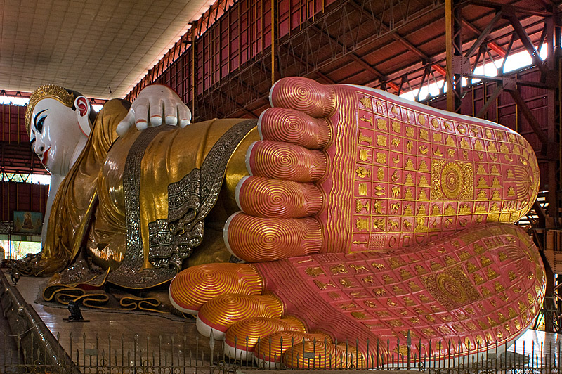 Ein kleiner Abstecher führt uns zur Kyaukhtatgyi Pagode. Dort befindet sich eine riesige liegende Buddhafigur. Mit einer Länge von 70 m ist sie damit eine der größten des Landes. Rings um die Pagode blickt man auf verrostete Wellblächdächer hinter denen sich immer wieder gold verzierte Tempeltürme erheben.