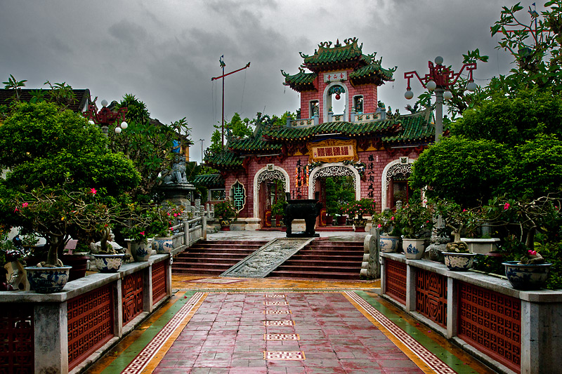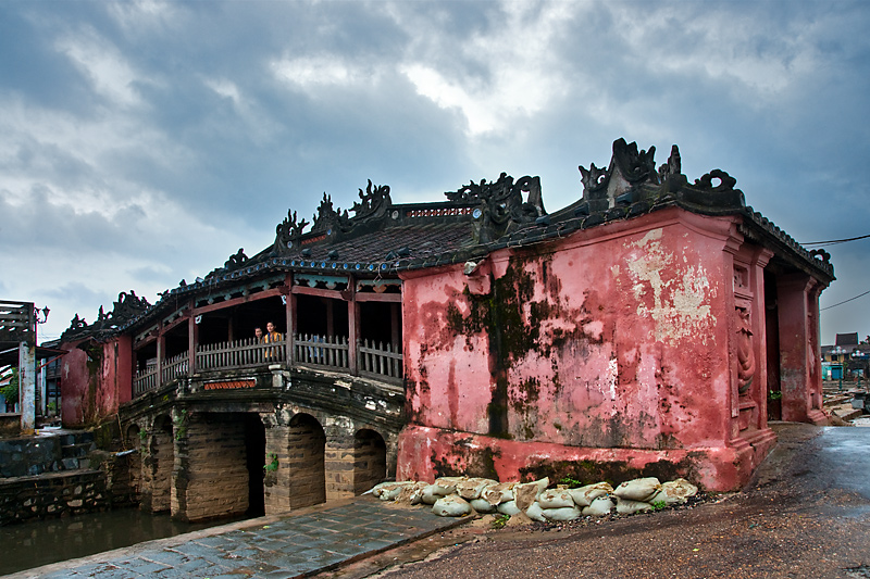 Am frühen Morgen des nächsten Tages machen wir uns auf den Weg in die historische Altstadt. Der Weg dahin führt über die Japanische Brücke. Die Brücke, die über einen Seitenarm des Thu-Bon Flusses führt, stammt aus dem Jahre 1593 und stellt heute das Wahrzeichen des kleinen Städtchens dar. Unser erstes Ziel ist eines der zahlreichen idyllischen, alten Holzhäuser aus dem frühen 19. Jahrhundert. Entscheidend beim Bau von Häusern dieser Art war, den drei wichtigsten Elementen im chinesischen Leben den ihren gebührenden Raum zu schaffen, der Ahnenverehrung, dem Geschäft und dem Familienleben, und zwar in dieser Reihenfolge. Die Häuser wurden von innen nach außen gebaut, zuerst kamen die Säulen, dann wurde der Dachfirst errichtet und zum Schluß wurde das Ziegeldach fertiggestellt.